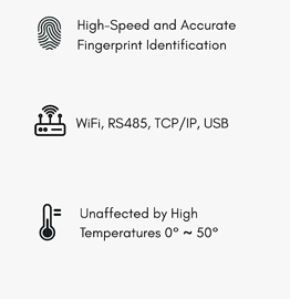 | Standard Functions | Anti-passback, Auto Status, Record Query, T9 Input, 14 Digit User ID |